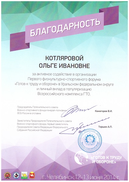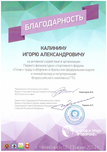 Руководителям благотворительного фонда «СВОИ ДЕТИ» Игорю Калинину и Ольге Котляровой были вручены благодарности за активное содействие в организации Первого физкультурно-спортивного форума «Готов к труду и обороне» в Уральском федеральном округе и личный вклад в популяризацию Всероссийского комплекса ГТО.