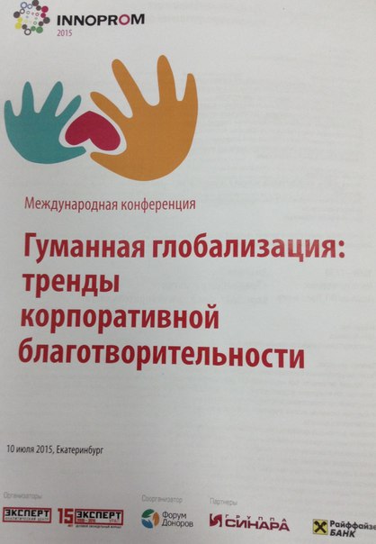 Сотрудники благотворительного фонда " Свои дети" в лице директора Котляровой Ольги и заместителя директора фонда Мурзиной Ксении принимают участие в Международной конференции " Гуманная глобализация: тренды корпоративной благотворительности". Эта конференция проходит в рамках выставки Иннопром - 2015 в городе Екатеринбурге.