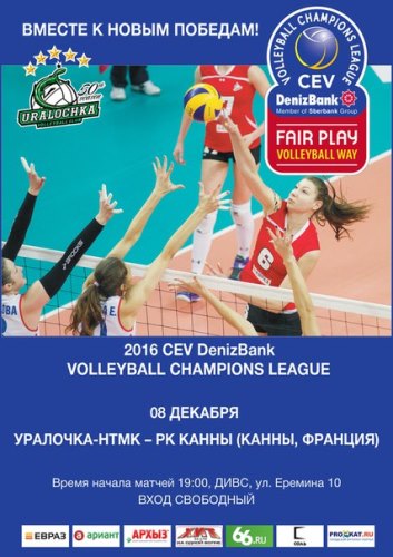 Игра пройдет в ДИВСе, где наша команда "Уралочка-НТМК" встретится с французским "Канн". Начало 19:00, свободный вход.